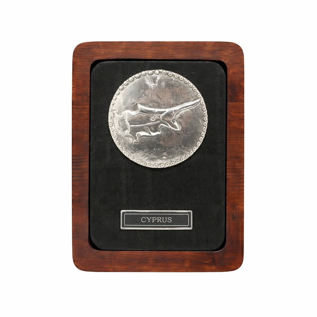 Honor Cyprus and its heritage with this Handmade Silver Cyprus on Leather Plaque (15cm). Featuring a finely detailed silver representation of the island, mounted on a luxurious leather base, this piece makes an elegant and meaningful display.