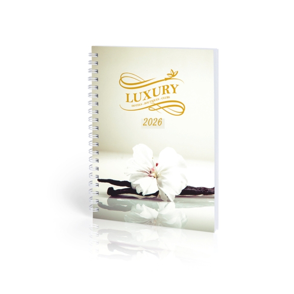CUSTOM A5 SPIRAL CALENDAR. FULL COLOR COVER & BACK COVER. FIRST & LAST PAGE FULL COLOR. 90 PAGES (4 DAYS PER PAGE) ONE COLOR PRINTING