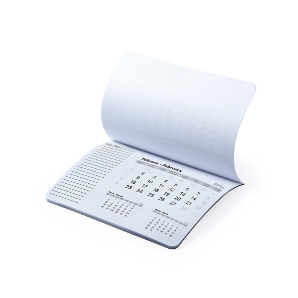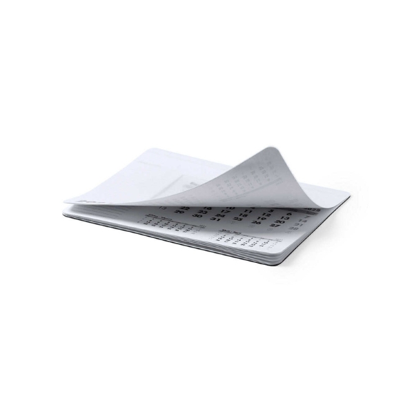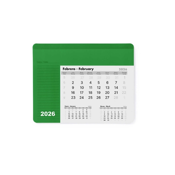This calendar mousepad features 12 inside sheets, showcasing the current, previous, and upcoming periods, along with a notes area. It includes a transparent protective cover and a non-slip padded base for stability.