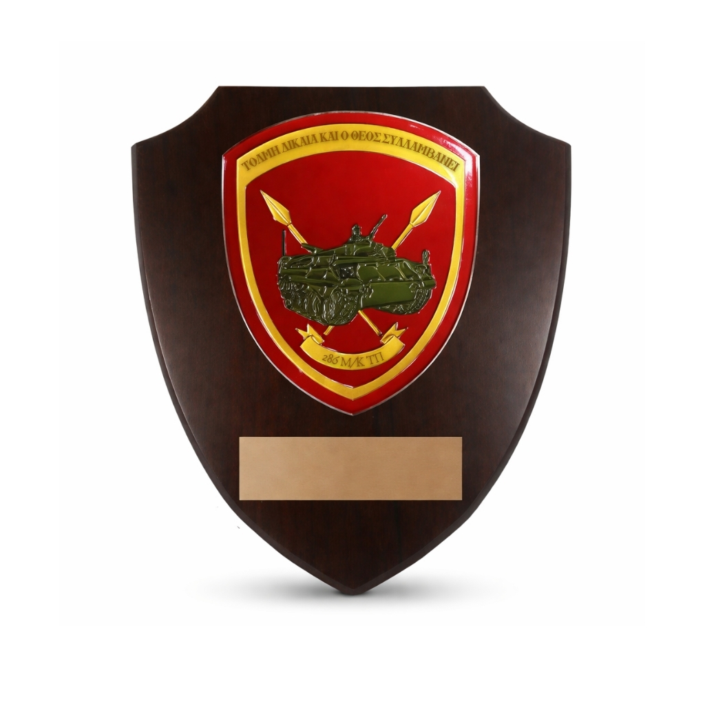 Honor service, strength, and dedication with the 286 Μ/Κ Shield Plaque 22x18cm, a professionally crafted military award designed for formal recognition within the 286 Μ/Κ unit. This shield-shaped plaque features a custom-printed plate included in the price, making it ideal for commemorating achievements, retirements, anniversaries, or special events.