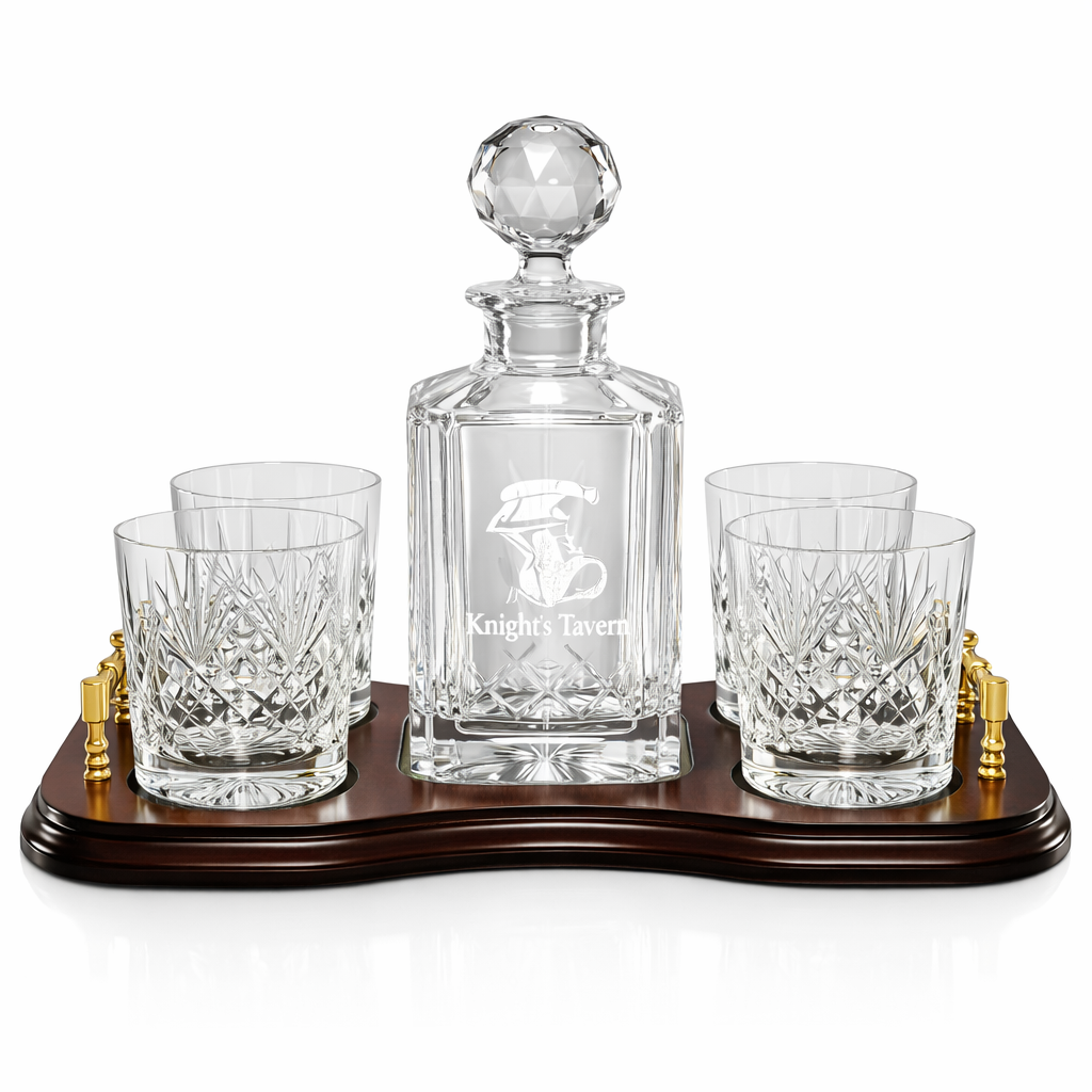 The 5pc whisky set wood base is an ideal presentation set for retirements or awards when combined with a square spirit decanter and 4 tumblers. The glasses shown with it in the photo are the R4 decanter and HM55 tumblers, although it can be used with the majority of other square spirit decanters and tumblers in our range.
