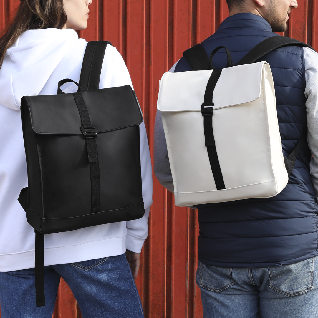 Backpack made of soft PU. With a main pocket and buckle closure system. Large capacity interior with padded compartment for laptops up to 14 inches or tablets up to 10 inches. Padded back and straps. Includes strap for trolley.