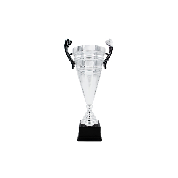 Champions line trophy with height 49cm and conical cup in silver color. Mounted on a black base.