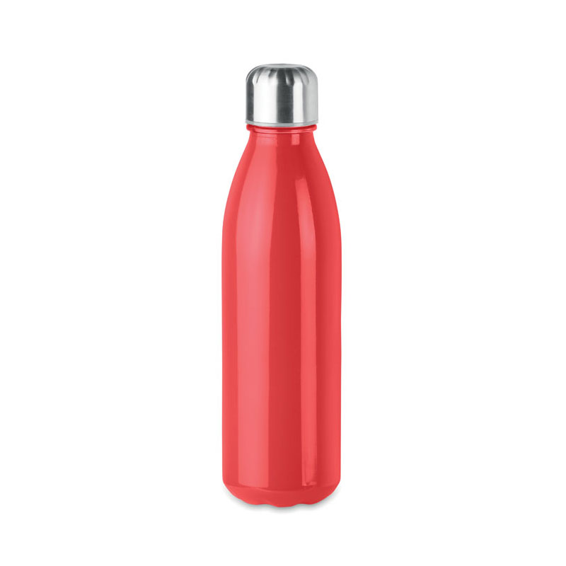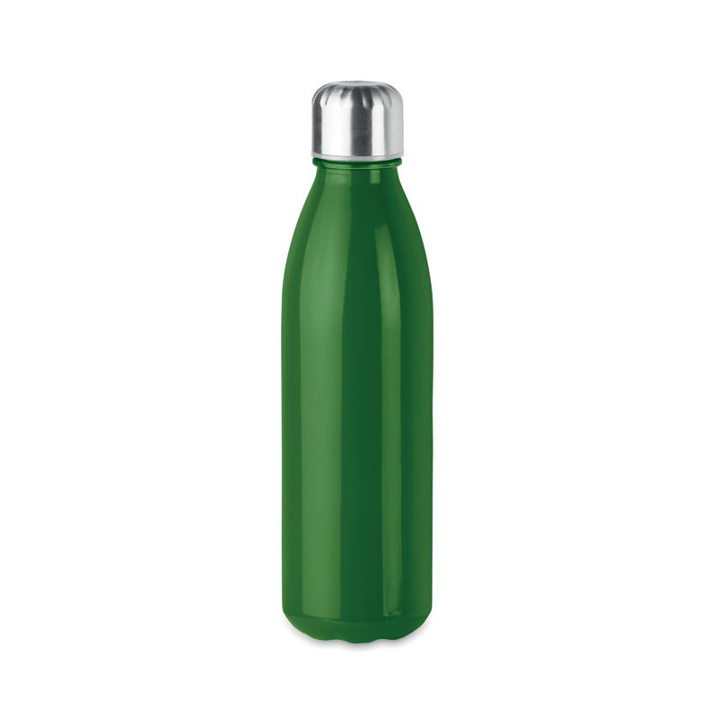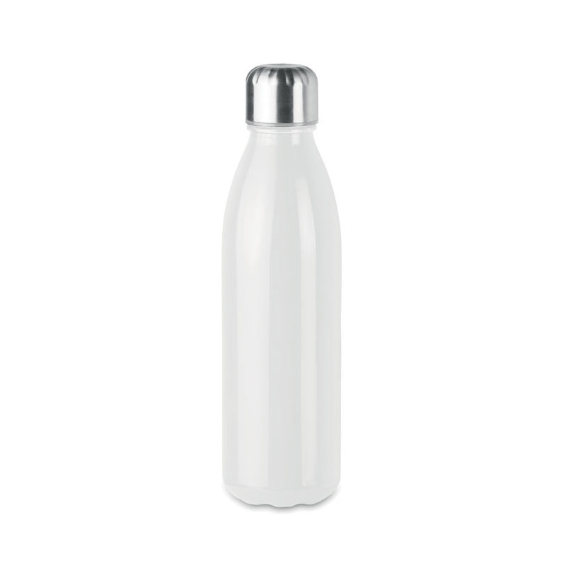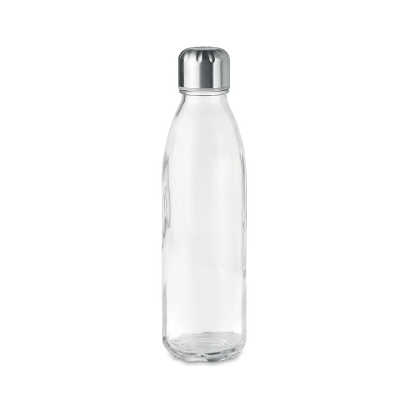 Glass drinking bottle with stainless steel lid. Capacity: 650 ml. Not suitable for carbonated drinks. Leak free.