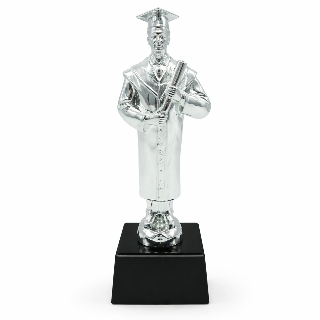 Graduation trophy award in silver. Mounted on a black base. Use this attractive award to honor the achievement.