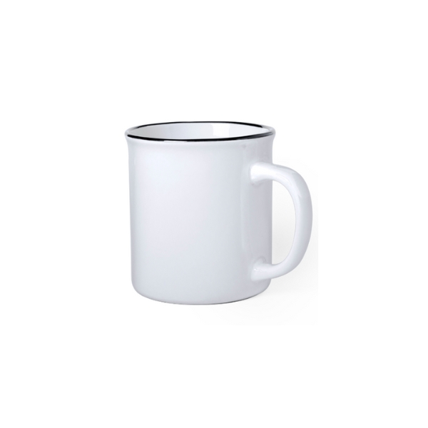 300ml AA ceramic mug with vintage design. In combination with outside in a wide range of tones and inside in white with black piping. Presented in an individual box.
