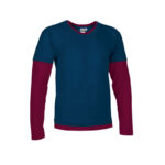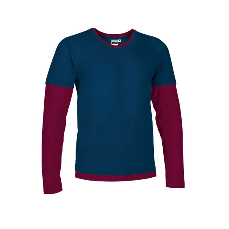 Long sleeves are made of 100% ring-spun cotton plain knit fabric. Double sleeves, neck, and hem with contrasting color, simulating wearing a short-sleeved shirt over a long-sleeved one.