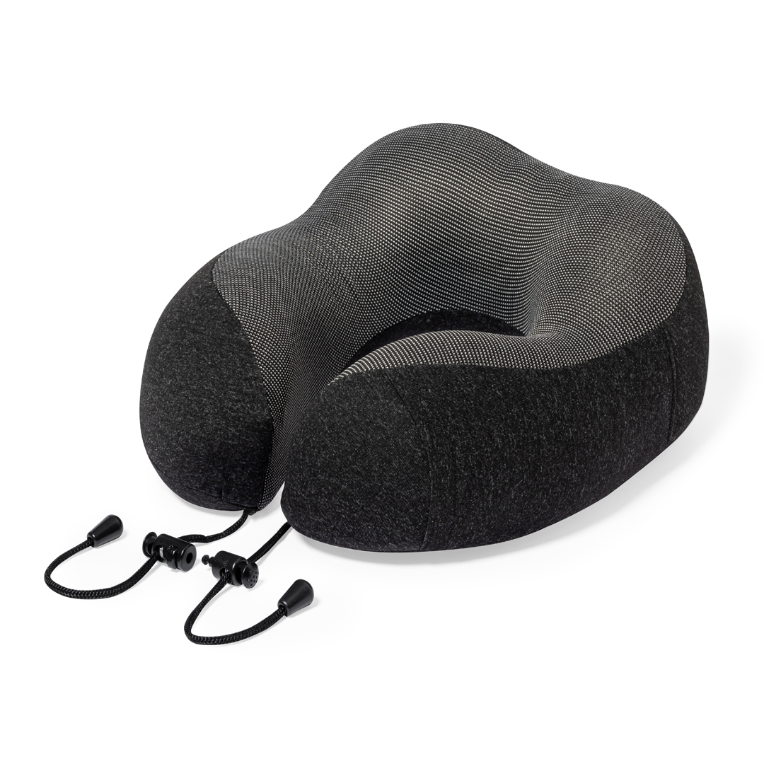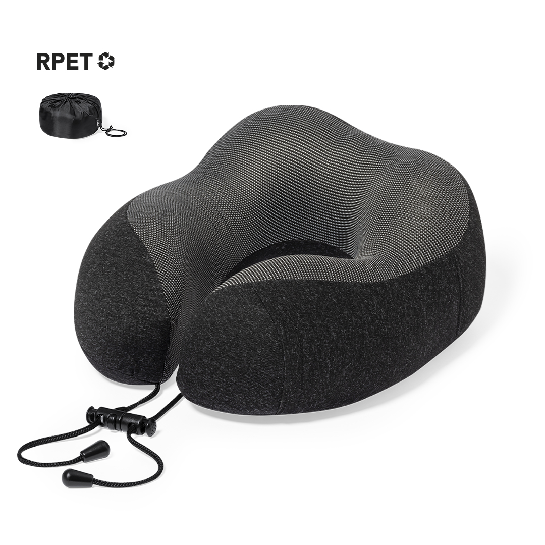 Comfortable and padded portable neck pad. Ultimate comfort experience for any journey due to the soft touch padding and drawstring fasteners for a correct and comfortable fit. With RPET pouch for protection during transport and label.