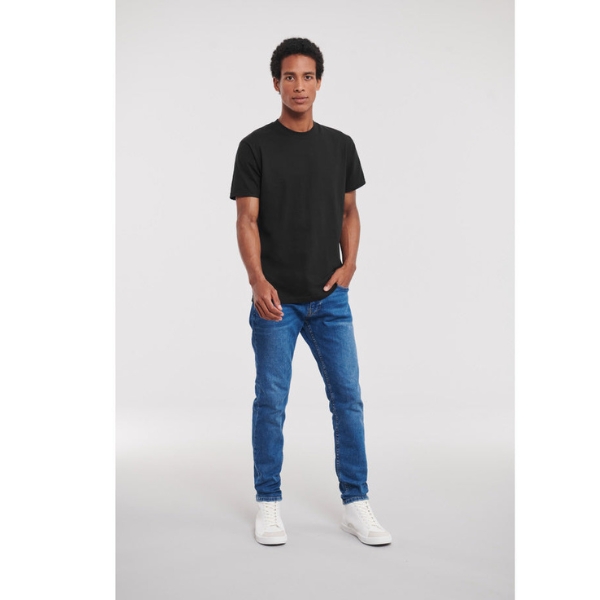 CLASSIC BLACK T-SHIRT BY RUSSELL ATHLETIC. 100% Ringspun Cotton *Light Oxford 93% Cotton, 7% Viscose. 180 g/m². Laundry washes at or below 40°C.