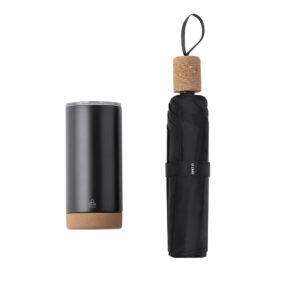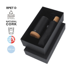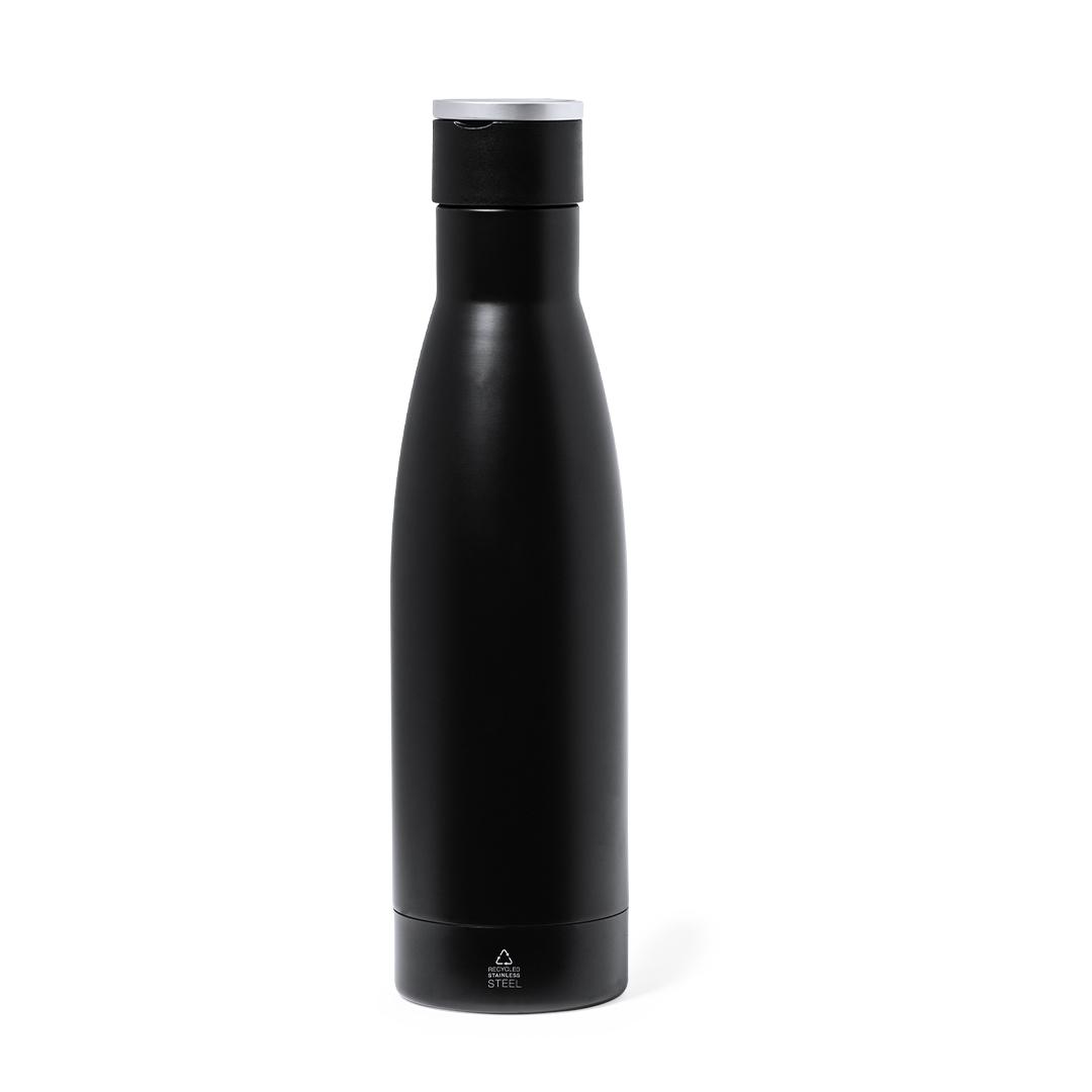 500 ml capacity, double-layer flask made in Recycled Stainless Steel with matte black finish, and rigid handle in matte silver metal. With a stainless steel logo.