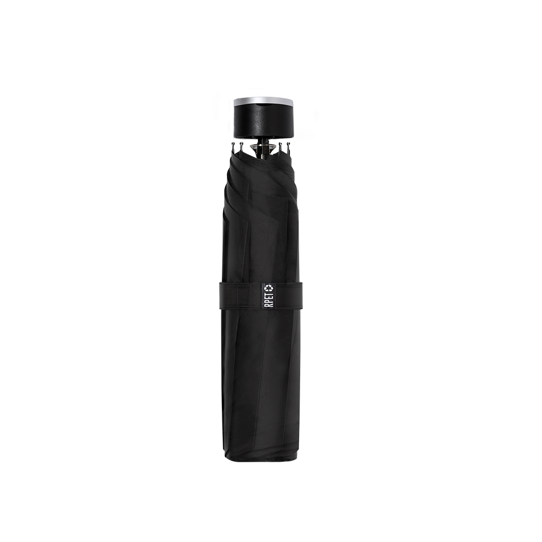98 cm diameter folding umbrella in black color. Made in 190T RPET pongee material. Manual opening, with windproof mechanism and fiberglass ribs. With carrying sleeve and matching straps. With distinctive RPET label.