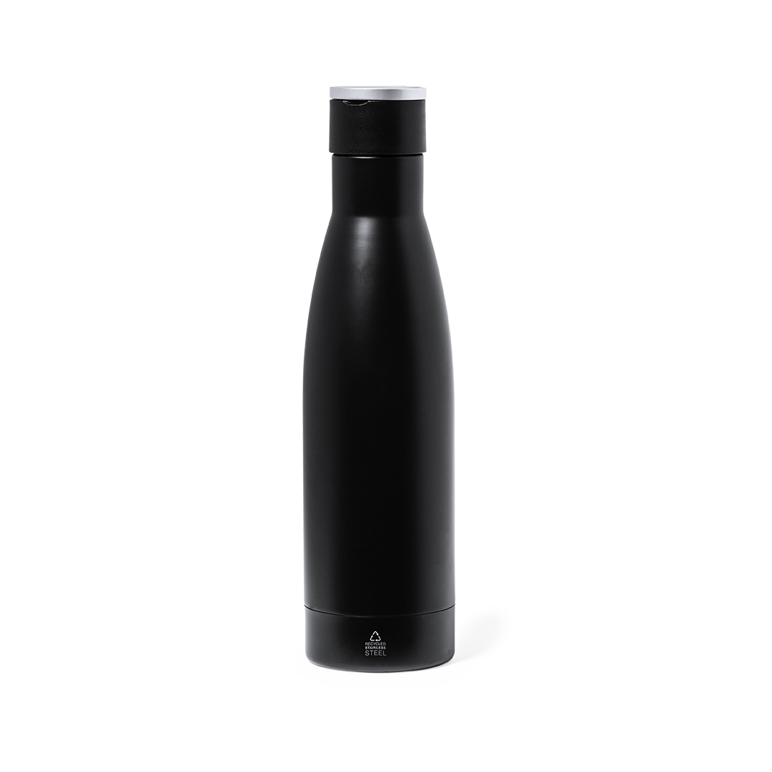 Recycled stainless steel double-layer thermos bottle with matte black finish and 500ml capacity. Matte silver metal handle, With stainless steel badge.