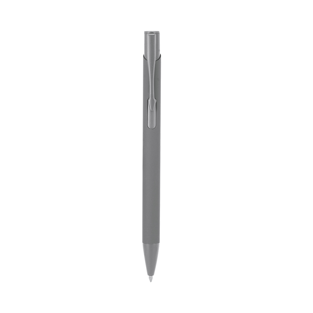 – Recycled aluminum pen, with a rubber-finished body. It has a clip, push-button mechanism, and blue ink. Includes a recycled aluminum badge.