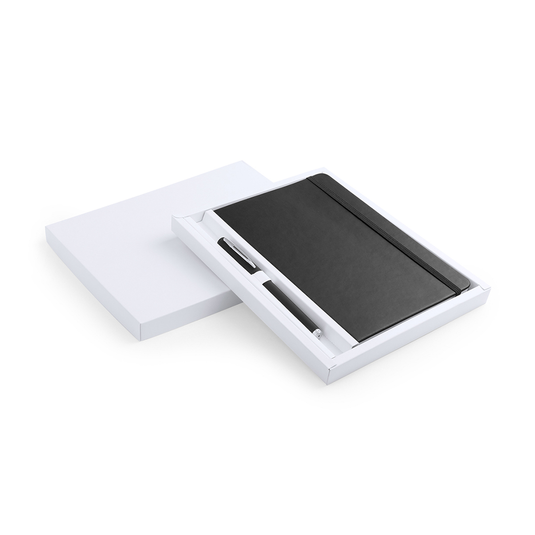 Notepad set with soft-touch covers in PU leather and a matching color soft body pen. 100 blank sheets with elastic support and a matching color fabric bookmark. Presented in an elegant white die-cut cardboard box. Ball pen with blue ink.
