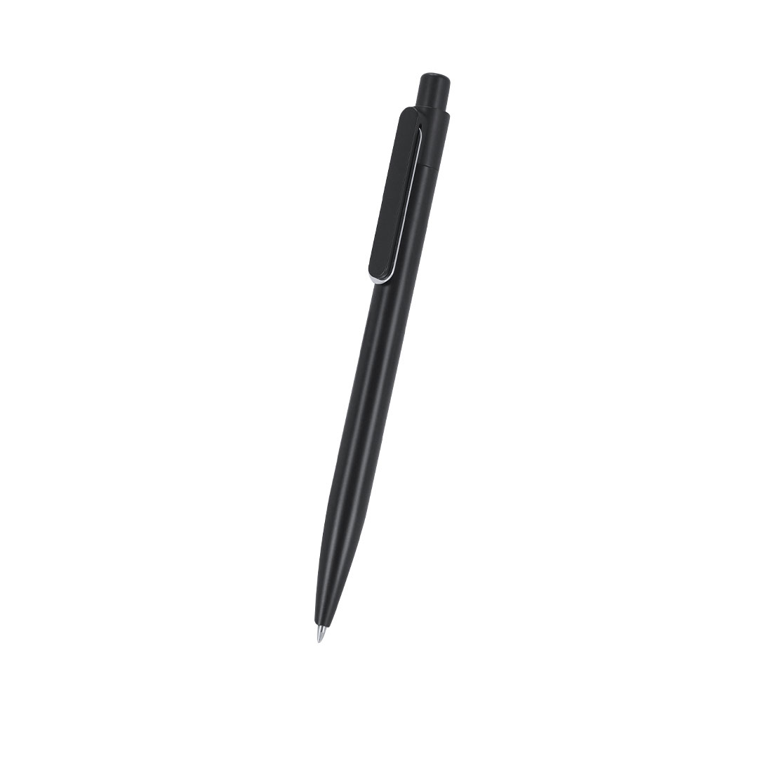 – Matte black ballpoint pen made from Recycled Aluminum with a push mechanism, clip, and decorative metal element.