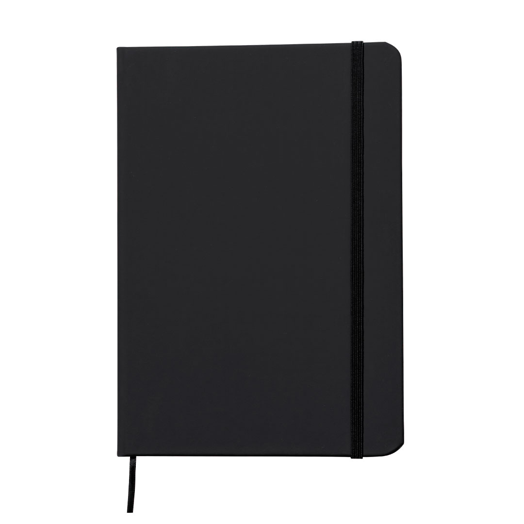 – PU notepad with rigid and soft covers, with 80 striped pages, an elastic band, and a matching bookmark.