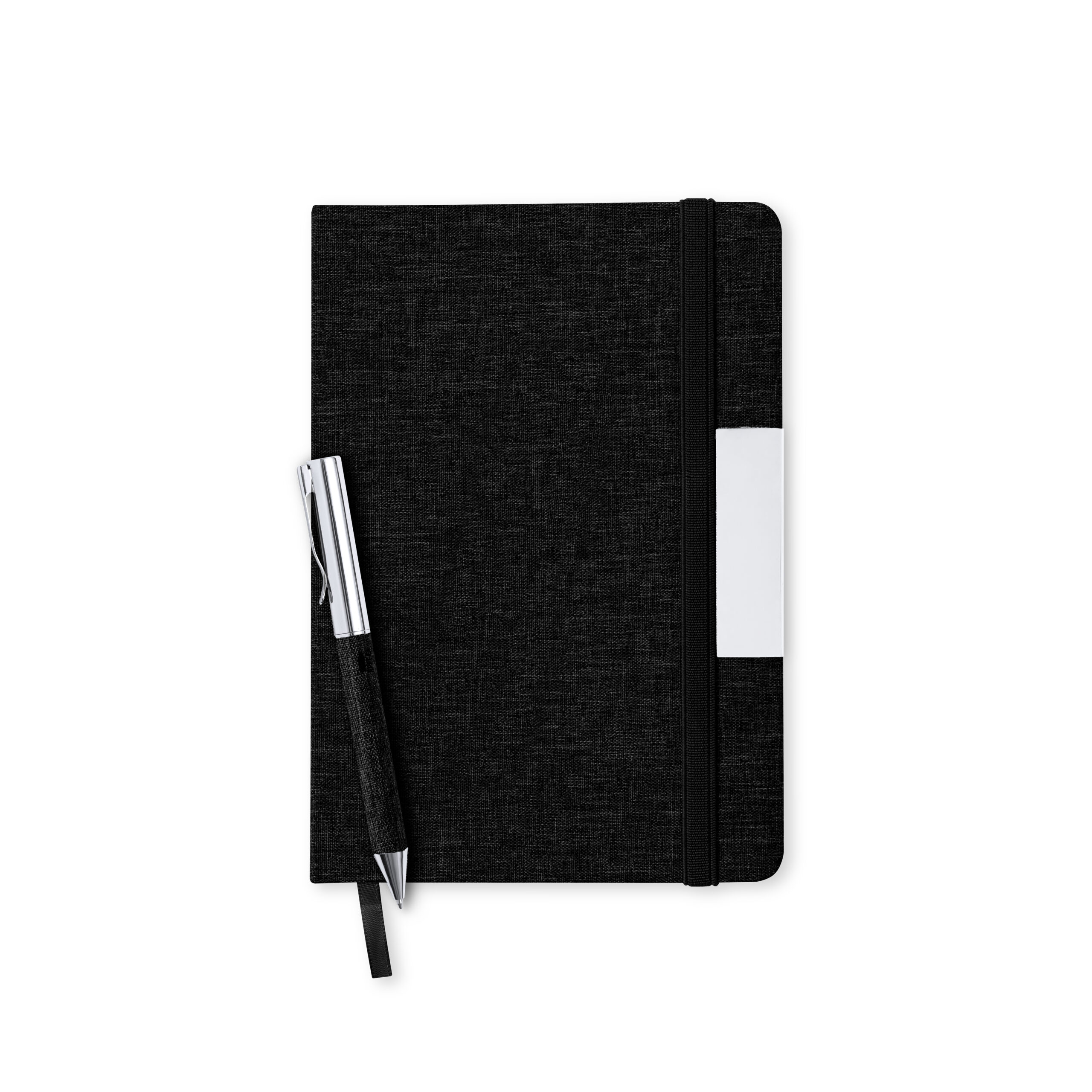 Hard cover notepad, with metal insert on front cover, fabric bookmark and matching elastic binding. 100 sheets inside with striped layout and RPET distinctive at the back cover.