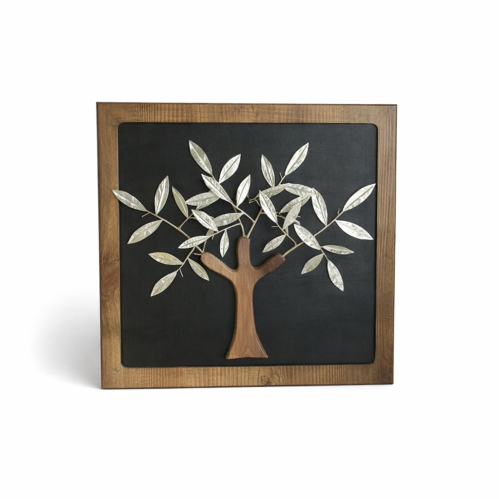 Material: Handmade silver olive tree on genuine leather plaque