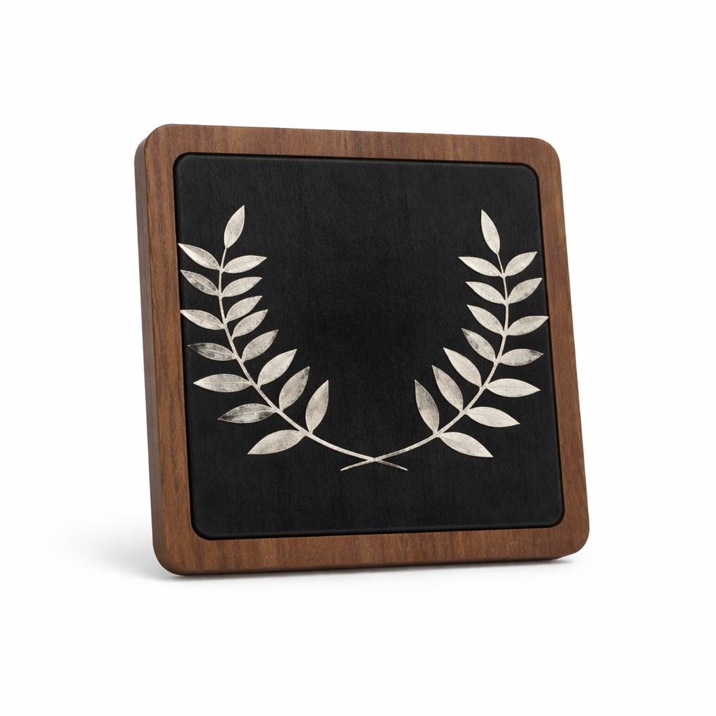 Celebrate honour, heritage, and achievement with this Handmade Silver Olive Wreath on Leather Plaque (23x23cm). Crafted with meticulous attention to detail, the silver olive wreath, a symbol of victory and peace, is elegantly mounted on a premium leather-wrapped wooden plaque for a luxurious presentation.