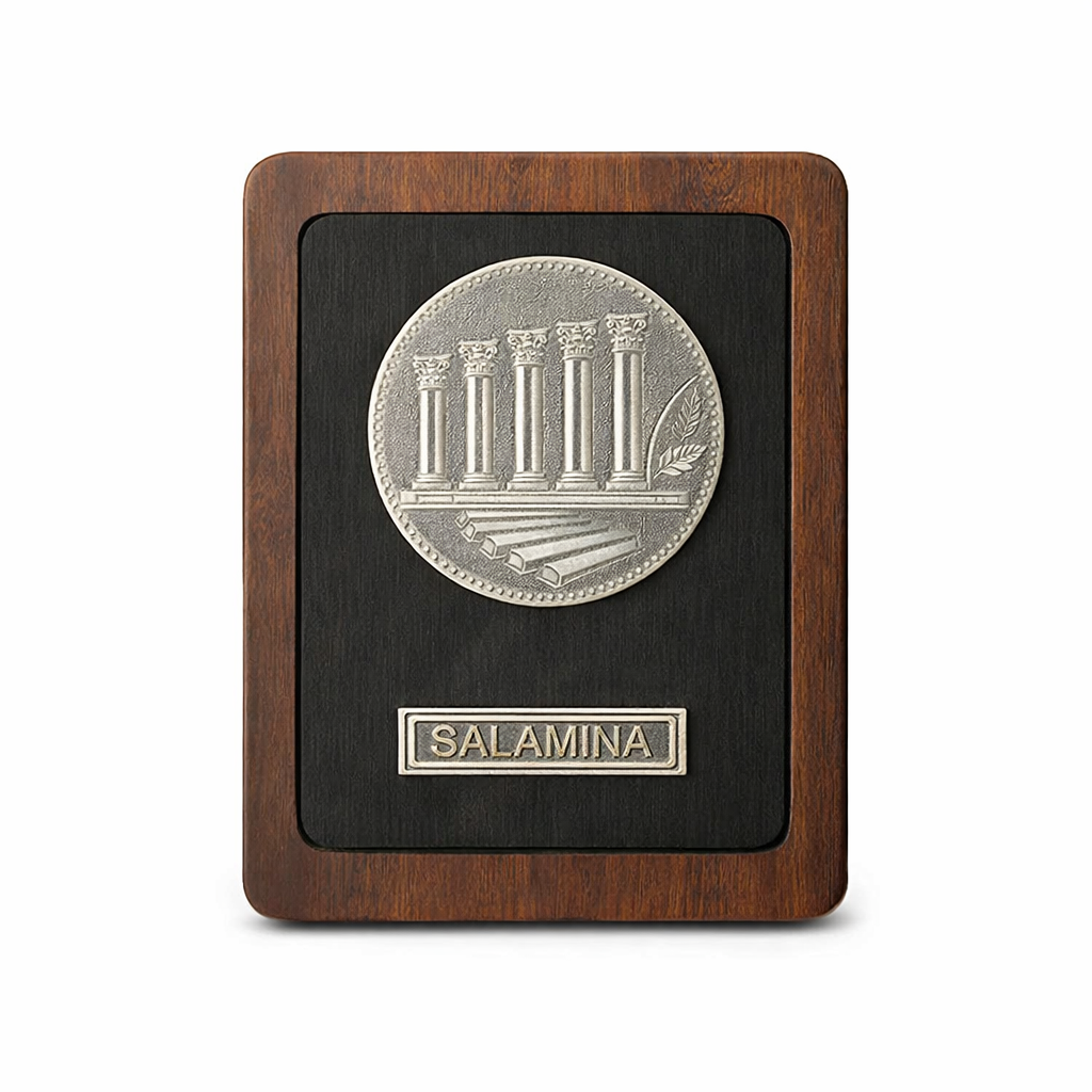 Celebrate heritage and craftsmanship with the Handmade Silver Salamina on Leather Plaque (18cm). This striking piece features a detailed silver depiction of Salamina, elegantly mounted on a rich leather background perfect for commemorations, awards, or cultural appreciation gifts.