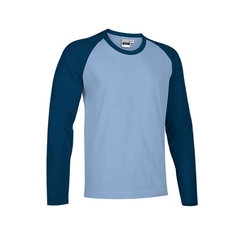 Two-tone t-shirt, classic cut and long sleeves, made of 100% ring spun cotton plain knit fabric. Long raglan sleeves and neck in a different color combination. Round ribbed neckline and double stitching on the neckline, hem and sleeves. Assortment of mixed colors. Urban and colorful style.