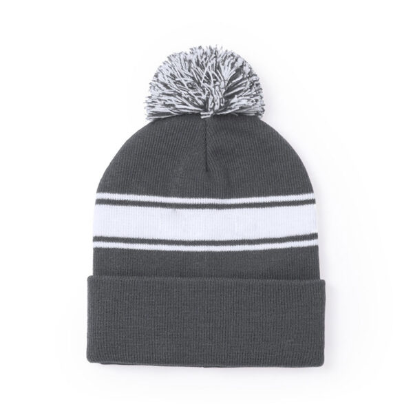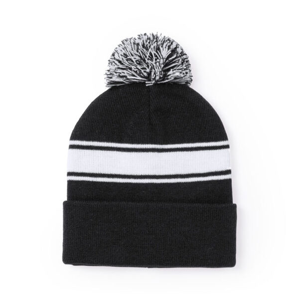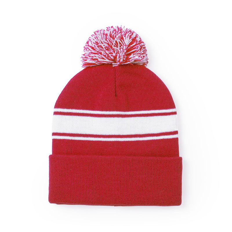 Soft and warm cap made in acrylic material, in a wide range of colors. Original design, with white front strip and bicolor pom pom in matching color. Winter.