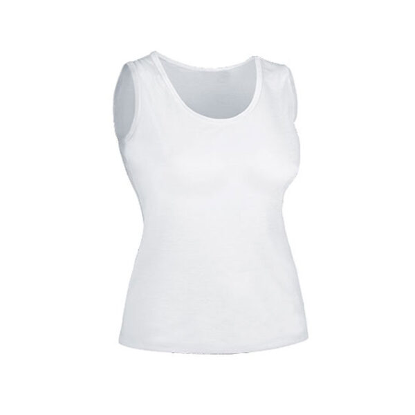 Women’s t-shirt with wide straps, made of plain polyester knit fabric with a soft touch like cotton and a treatment suitable for sublimation. Sleeveless, racer back. Round neckline and ribbed straps and double stitching at the hem. T-shirt adapted to the pattern of the female body, created especially for printing through the sublimation process.