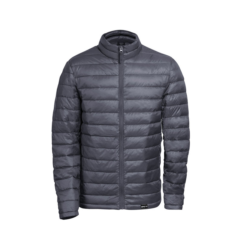 In extra light feather effect material, waterproof and windproof, with interior padding. Zippered neck with flap and puller strap; large zippered side pockets. RPET label and available in a wide range of colors. Wind and Water Resistant. RPET Pouch Included. Winter.