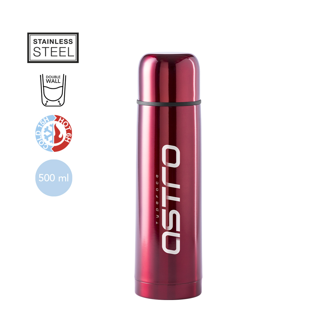 500ml capacity, stainless steel thermos flask in glossy finish. With safety stopper/mug and presented in an attractive design box.