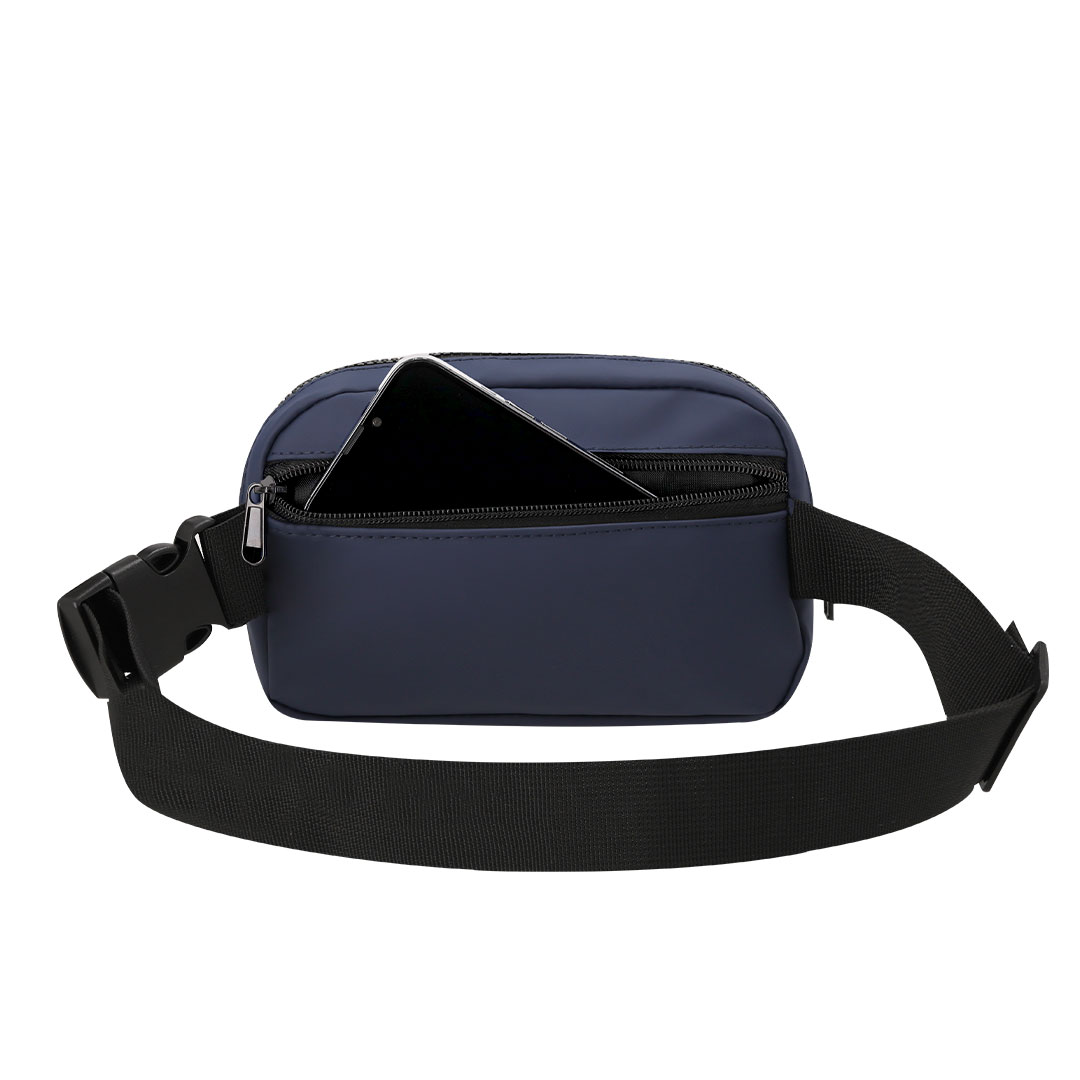 Belly bag design made from PU. Features a central pocket with zipper closure and adjustable strap with buckle closure. Additionally, it includes a rear pocket with zipper closure for added security.