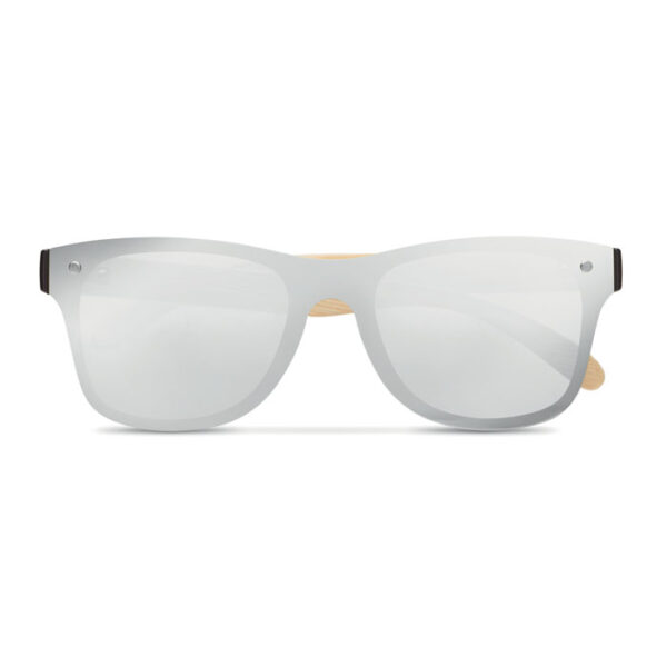 Sunglasses with bamboo arms and all over mirrored lens. UV400 protection. As bamboo is a natural material, the colour per item an vary.