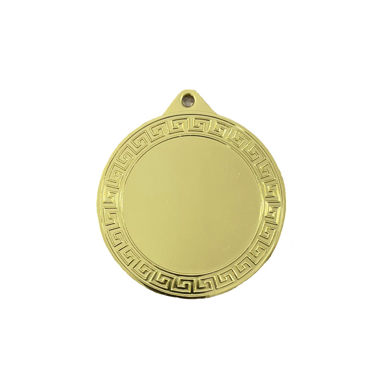 Steel round medal in gold color with a diameter of 7cm and details on the rim with ancient symbol.