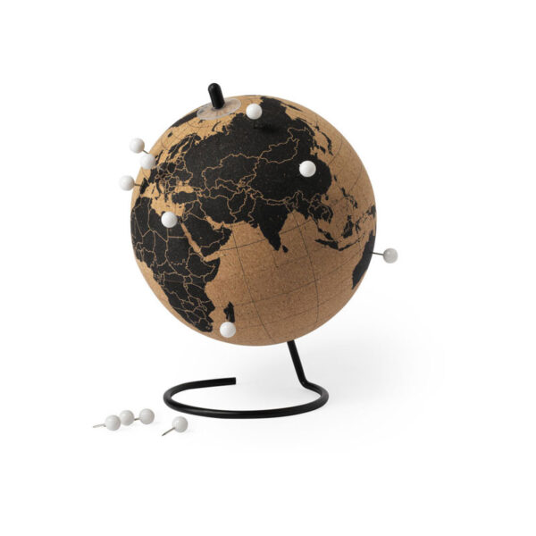 Earth globe in nature line for traveling lovers. Made of natural cork, with metal base and 12 marking pins. Presented in an attractive, individual, eco design box.