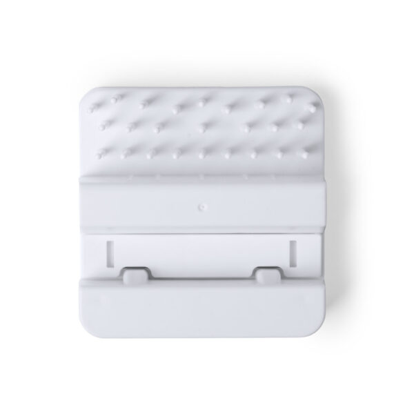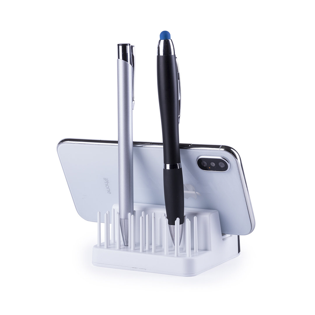 Smartphone/tablet holder in minimalist white color design. With a gadget organizer at the back. Front printing area especially designed for laser engraving, making your logo or brand to be properly illuminated with white light.