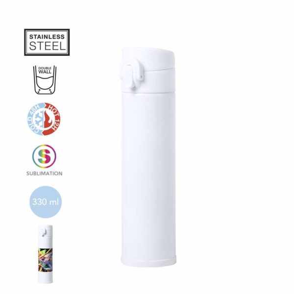 330 ml thermo in stainless steel. Double wall for a better and longer preservation of liquid’s temperature, with security lock and including an easy, button opening mechanism. Especially manufactured for sublimation printing and presented in an attractive design box