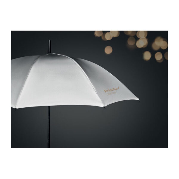 23 inch manual open windproof umbrella in high reflective polyester with fiberglass shaft and ribs. Black plastic tips and top. Black rubberized grip. Manual closure. Winter.